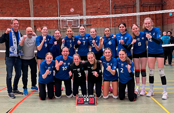 - Ab 14.00 Uhr stieg dann an gleicher Stelle die Qualifikationsrunde B zur Westdeutschen Meisterschaft für unsere wU16. Es wurde ein dramatisches Turnier, bei dem unsere Mädchen nach der Auftaktniederlage gegen TuB Bocholt (1:2; 21:25, 25:21, 5:15) ihre WDM-Hoffnungen schon fast verloren sahen, nach dem 2:0 gegen Bielefeld (25:7, 25:19) aber im Match gegen den favorisierten NRW-Ligisten VoR Paderborn, der seine ersten beiden Spiele gewonnen hatte, alles an Mut und Energie reinwarfen und mit der Unterstützung ihres lautstarken Anhangs ein herausragendes Match ablieferten. Satz 1 ging noch knapp an Paderborn (22:25), doch die Erfahrung, mithalten zu können, beflügelte Lauras Mannschaft und mit 25:18 gelang der umjubelte Satzausgleich. Im entscheidenden Tie-Break lag der BSV schon 9:12 hinten und musste abermals fürchten, die WDM verpassen zu müssen. Dann drehten unsere Mädchen die Partie jedoch noch einmal um und holten mit Alessia am Aufschlag die letzten sechs Punkte (15:12). Nun standen mit Bocholt, Paderborn und dem BSV drei Teams mit identischer Punkt- und Satzbilanz da und der Ballpunktequotient musste über die Rangfolge und die Vergabe der beiden WDM-Ticktes entscheiden. Als Erster ging daraus Bocholt hervor, der BSV wurde Zweiter und darf damit Ende März zur Meisterschaft nach Lüdinghausen fahren - die allerherzlichsten Glückwünsche ans gesamte Team für diesen tollen Erfolg!