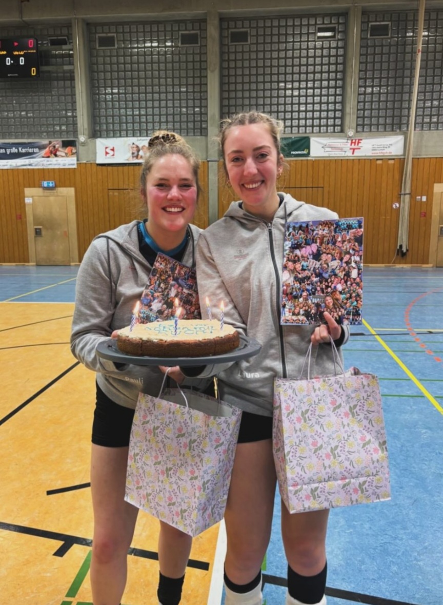 Als hätte die Partie unserm Team nicht schon genug Emotionen entlockt, folgte nach dem Essen in der Halle noch ein wehmütiger Epilog: Mit Pauli und Laura wurden zwei weitere Mitstreiterinnen verabschiedet, die auf dem Hintergrund anstehender Herausforderungen im Arbeitsleben darum gebeten hatten, für die kommende Saison ohne sie zu planen. Schon in dieser Saison hatten sie so viel investiert, um neben ihrer beruflichen Beanspruchung voll für das Team da zu sein. Hannah übernahm es, an die gemeinsame Zeit zu erinnern, warmherzig die Qualitäten der beiden auf und neben dem Spielfeld herauszustellen und garniert mit Anekdoten die bleibenden Spuren und schmerzlichen Lücken, die sie hinterlassen, aufzuzeigen.