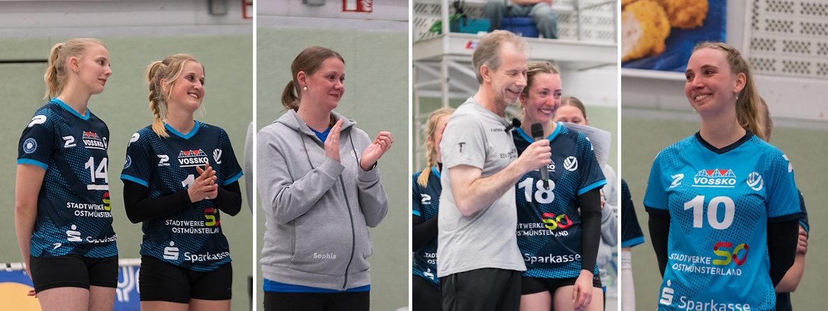 Schließlich galt es auch Abschied zu nehmen von den Sabrina, Sophia und Lea. Mit ihnen gehen die drei letzten Spielerinnen der "Goldenen Generation", die die Entwicklung des Ostbeverner Volleyballs in den vergangenen zwei Jahrzehnten so maßgeblich geprägt hat, von Bord. Zwei langjährige Kapitäninnen und eine BSV-Zuspiel-Legende - drei "Gesichter dieser Mannschaft", deren Erfolge im Jugend- und Erwachsenenbereich, in der Halle wie im Sand den Vereinsnamen weit über regionale Grenzen hinweg bekannt gemacht haben und auf wie neben dem Spielfeld den Charakter und die Ausstrahlung des Teams geformt haben. Hannah, Melina und Marie für die Spielerinnen und Dominik für den Verein beschrieben den Verlust, den ihr Abschied bedeutet, aber auch die warmherzigen, dankbaren Erinnerungen, die bleiben. Auch für die drei kein leichter Moment, doch zusammen schafften sie es tapfer, wie sie so vieles zusammen gerockt haben.